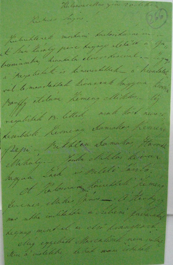 [266r] Kolosvar Marzius 20dikén Kedves Lajos! Kedvetlenek mostani tudositásaim. — A' Szász Károly pere tegnap eldőlt a' Guberniumba, hivatala elvesztésével. — Tegnap a' Regalisták-is kineveztettek — a' hivatalokról le mondottak kivannak hagyva kivévén Bánffy Ádám Kemény Miklos. — Uj regalisták 13. lettek, — azok kőzt nevezetessebbek Kemény Domokos, Kemény Pepi, — Bethlen Domokos, Horvath Mihály. — Josika Miklos kivan hagyva, Zách, és Béldi László.