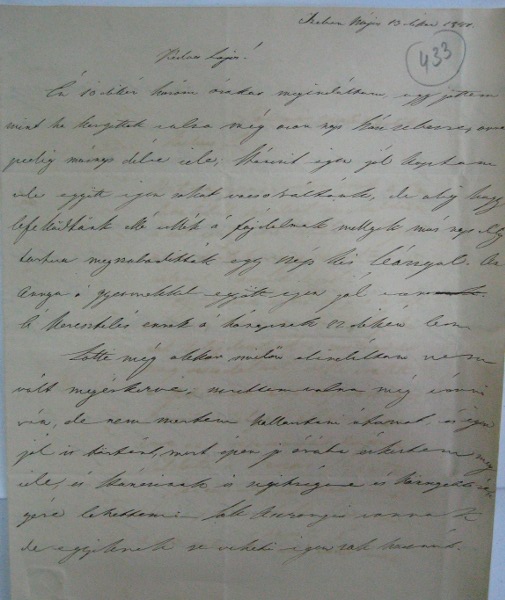 [433r] Szeben Május 13dikan 1841. Kedves Lajos! Én 10dikén három órakor megindúltam, ugy jöttem mint ha kergettek volna még azon nap Szászsebesre, onna pedig másnap délre ide; Stánczit igen jól kaptam vele együtt igen sokat vacsoráltúnk, de alig hogy lefeküdtünk ellé vették a' fajdalmak mellyek más nap délig tartva megszabaditták egy szép kis leányal. Az Annya a’ gyermekkel egyött igen jól van. A' keresztelés ennek a' hónapnak 22dikén lesz.