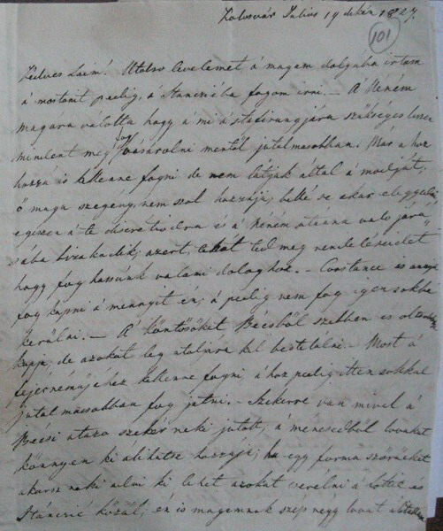 [101r] Kolosvár Julius 19 dikén 1827. Kedves Laim! Utolso levelemet a' magam dolgába irtam a' mostanit pedig, a' Stancziéba fogom irni. — A' Néném magára válolta hogy a' mi a' stafirungjára szűkséges leszen mindent meg fog[1] vásárolni mentől jutalmasobban. Már a hoz hozzá is kellene fogni de nem látjuk által a' modját; ő maga szegény, nem szol hozzája, bellé se akar elegyedni, egészen a' te discrétiodra és a' Néném utánna valo járásába bizakodik; azert, tehát ted meg rendeléseidet hogy foghassúnk valami dologhoz. — Constance is annyit fog kapni a' mennyit én; a' pedig nem fog igen sokba kerűlni. — A' kőntősőket Bécsből szebben és oltsobban kapja; de azokat leg utoljára kel bestelálni. — Most a' fejérnéműjéhez kellene fogni a' hoz pedig itten sokkal jutalmassabban fog jutni. — Szekerre van mivel a' Bécsi utazo szekér neki jutott; a' ménesedből lovakat kőnnyen ki álitatsz hozzája; ha egy forma szőrűeket akarsz neki adni ki lehet azokat cserélni a' Lottie és Stánczié kőzűl; én is magamnak szép négy lovat álitattam [1] Beszúrva: fog