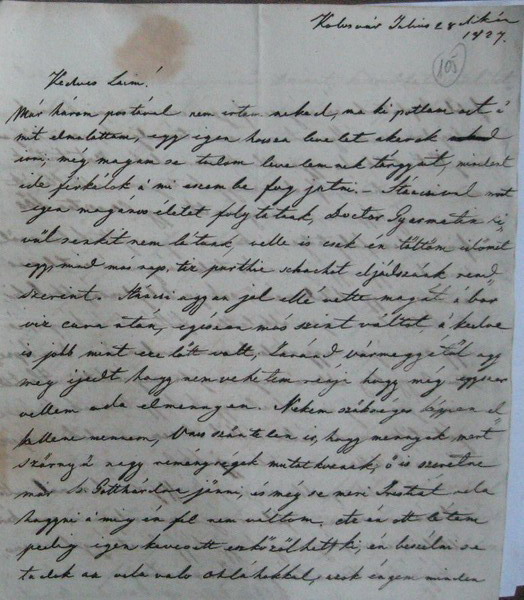 [105r] Kolosvár Julius 28dikán Kedves Laim! Már három postával nem irtam neked, ma kipotlom azt a' mit elmulattam, egy igen hosszu levelet akarok irni; még magam se tudom levelemnek tárgyait, mindent ide firkálok a' mi eszembe fog jutni. — Stánczival most igen magános életet folytatunk, Doctor Gyarmatin kivűl senkit nem látunk, velle is csak én tőltőm időmet egy, mind más nap, tiz parthie schachot eljádszúnk rendszerint. Stánczi ugyan jol ellé vette magát a' bor viz cura után, egészen más szint váltot, a' kedve is jobb mint ezelőtt volt; Zaránd Vármegyétől ugy meg ijedt hogy nem vehetem reája hogy még egyszer vellem oda elmennyen. Nekem szűkséges képpen elkellene mennem, Vass szűntelen ir, hogy mennyek mert szőrnyű nagy reménységek mutatkoznak; ő is szeretne már Sz. Gotthárdra jőnni, és még se meri Trestiát oda hagyni a' mig én fel nem váltom. Az én ott létem pedig igen kevesett eszkőzőlhett ki, én beszélni se tudok az oda valo ohláhokkal, azok éngem minden