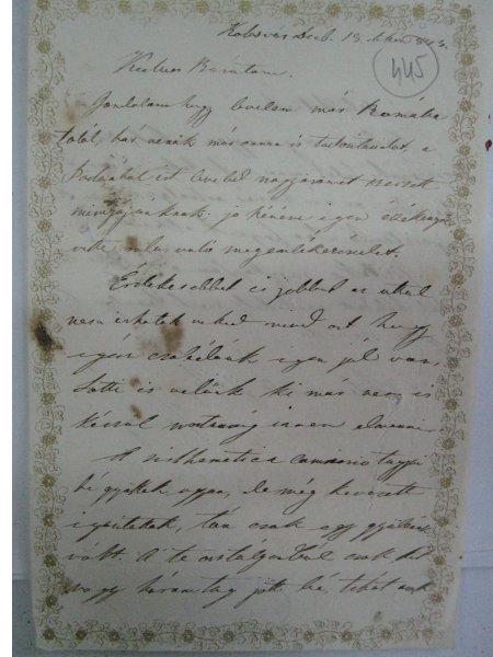 [445r] Kolosvár Decb. 15dikén 843. Kedves Barátom. Gondolom hogy levelem már Romába talál; bár veszük már onnan is tudositásidot, a Paduából irt leveled nagy örömet szerzett mindjájunknak; jo Néném igen érzékenyől vette rola való megemlékezésedet. 1A levélpapír az „m" helyén kiszakadva.