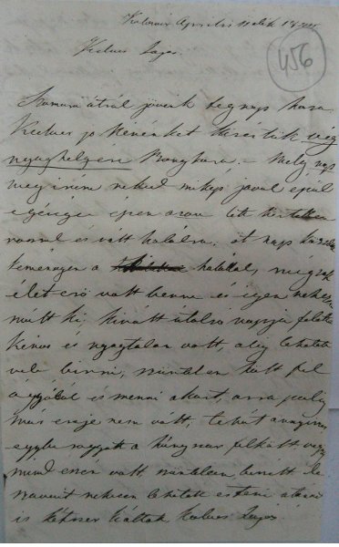 [456r] Kolosvár Aprilis 11dik 1844. Kedves Lajos. Szomorú útrúl jövénk tegnap haza: Kedves jo Nénénket kisértük végnyughelyérenap meg irám neked mikép javul épűl egésége épen azon lett hirt[elle]n roszul és vált halálra: öt nap küzdött keményen a <halalattal> halállal, még sok élet erö volt benne és igen nehezen múlt ki; kivált útolsó napja felette kinos és nyugtalan volt, alig lehetett vele birni; szüntelen költ fel ágyábúl és menni akart, arra pedig már ereje nem vólt; tehát annyiszor egyberogyott a hány szor felkölt; vegig mind eszén volt, szüntelen beszélt de szavait nehezen lehetett érteni: utánad is kétszer kiáltott, kedves Lajos!