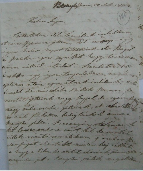 [464r] Bonyha1 Junius, 20 dik 1844. Kedves Lajos. Csötörtöken délútán útnak indúltam, e[s]tvére Gyéresre jöttem, hól másnap egy igen kedves napot töltöttűnk el: Paget és Polika igen sajnálták hogy te is nem arra vetted útadat. Szombaton 10. [ó]rakor2 egy igen terjedelmes ángól regelizés útán ujra útnak indúlánk; a kiáradt de már árkába szállott Maroson keresztűl jöttünk nagy bajjal de egész Ugráig nagy sárba vizbe jöttünk; ott edédeltűnk3 és csak fél hatra balagtúnk el onnan Bonyha fellé. Besenyön Ádámnak két lovas embere várt, kik keresztül vittek rémitő rossz útakon, 9. orakor Szederfáját elértük4 minden baj nélkül: a hogy a hidon keresztül akarúnk jönni eszembe jut a Bonyhai patak; meg állitom: 1 A szó ugyanazzal a tintával javítva.
