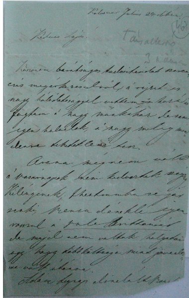 [467r] Kolosvár Julius 24. dikén. Kedves Lajos! Köszönöm baratsagos tudositasaidat szerencsés megérkezésedről, a' rajzot is nagy háládatossággal vettem -— hozzá is fogtam a' nagy múnkához denem igen haladok, a' nagy meleg mindenre tehetetlené tesz. 1 A szó ugyanazzal a tintával javítva.