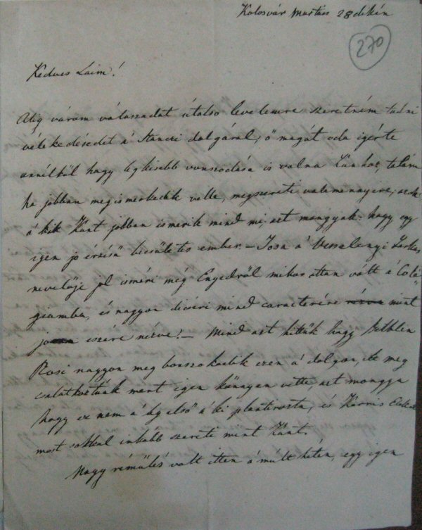 Alig várom válaszadat útolso levelemre szeretném tudni vélekedésedet a' Stanczi dolgárol, ő magát oda igérte annélkűl hogy leg kisebb vonszodása is volna Kunhoz, talám ha jobban meg ismerkedik velle, megszereti valamennyire; azok a' kik Kunt jobban ismerik mind mi; azt mongyak: hogy egy igen jo érzésű becsűletes ember: — Josa a' Vesselenyi Farkas nevelője jol isméri még Enyedről mikor ottan vólt a' Colégiumba, és nagyon dicséri mind caracterére mint jo eszére nézve. — Mind azt hittűk hogy Bethlen Rosi nagyon meg bonszokodik ezen a' dolgon, de meg csalatkoztúnk mert igen kőnnyen vette, azt mongya hogy ez nem a' legelső a' ki plantirozta, és Kornis Eleket most sokkal inkább szereti mint Kunt. |