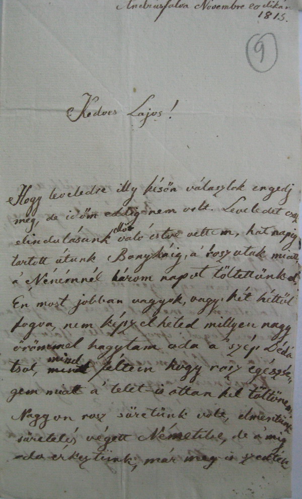 [9r] Andrásfalva Novembre 20dikán Kedves Lajos! Hogy leveledre illy későn válaszlok engedj meg, de időm eddig nem volt. Leveledet csak elindulásunk ellött[1] való estve vettem, hat napig tartott útunk Bonyháig, a' rosz utak miatt, a' Nénémnél három napot tőltettűnk el. Én most jobban vagyok, vagy két héttől fogva, nem képzelheted millyen nagy őrőmmel hagytam oda a' szép Dédátsot, mind[2] féltem hogy rosz egészségem miatt a' telet-is ottan kel töltönem. Nagyon rosz süretünk volt, elmentünk süretelés végett Németibe, de a' mig oda érkeztünk, már meg-is szedték