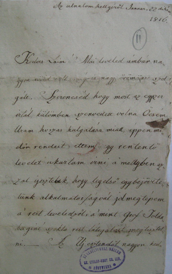 [11r] Az ulnalom hellyéről Januar. 22dikén. Kedves Laim! Mai leveled ámbár nagyon rövid volt, még-is nagy örömömre szolgált. Szerencséd hogy most az egyszer irtál, külömben szenvedett volna Öcsém Uram hoszas halgatása miatt, éppen midőn rendeit vettem[1] egy[2] rententő levelet akartam irni, a' mellyben azzal ijesztelek[3], hogy legelső egybejövetelünk alkalmatosságvál jol meg tépem a' rest leveledzőt, a'mint Grof Toldalaginé szokta rest látogatóit megtisztelni.— Az Uj esztendőt nagyon ked [Pecsét: Az Erdélyi Orsz. Múzeum Könyvtára. Gr. Gyulay-Kuun Cs. Lev.] [1] A levélpapír kikopott, a szó első betűje hiányzik. [2] A levélpapír kikopott, a szó első betűje hiányzik. [3] Az „l" javítva „n"-ből. |