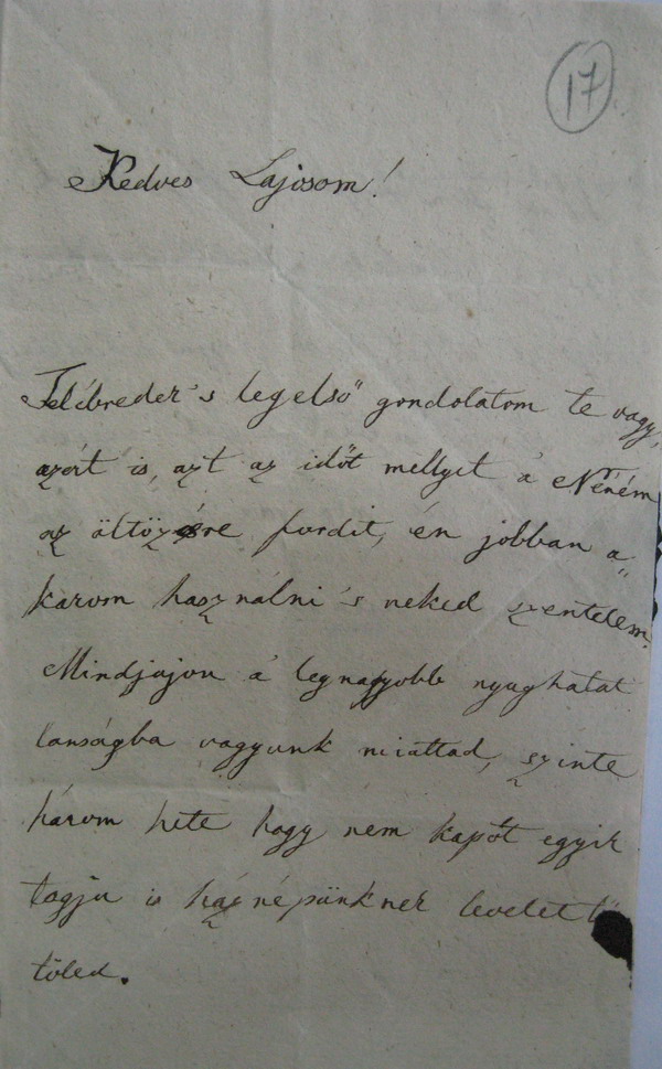 [17r] Kedves Lajosom! Felébredek 's legelső gondolatom te vagy, azért is, azt az időt mellyet a' Néném az öltözésre fordit, én jobban akarom használni 's neked szentelem. Mindjajon a' legnagyobb nyughatatlanságba vagyunk miattad, szinte három hete hogy nem kapót egyik tagja is ház népünknek levelet [tő][1] töled. [1] Tintafolt. |