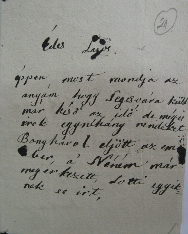 éppen most mondja az anyám hogy Segesvára küld már késö az idö de mégis irok egynéhány rendeket Bonyhárol eljött az ember[1], a' Néném már megérkezett, Lotti egyiknek se irt, [1] A lap szélén szétfolyó tintafolt. |