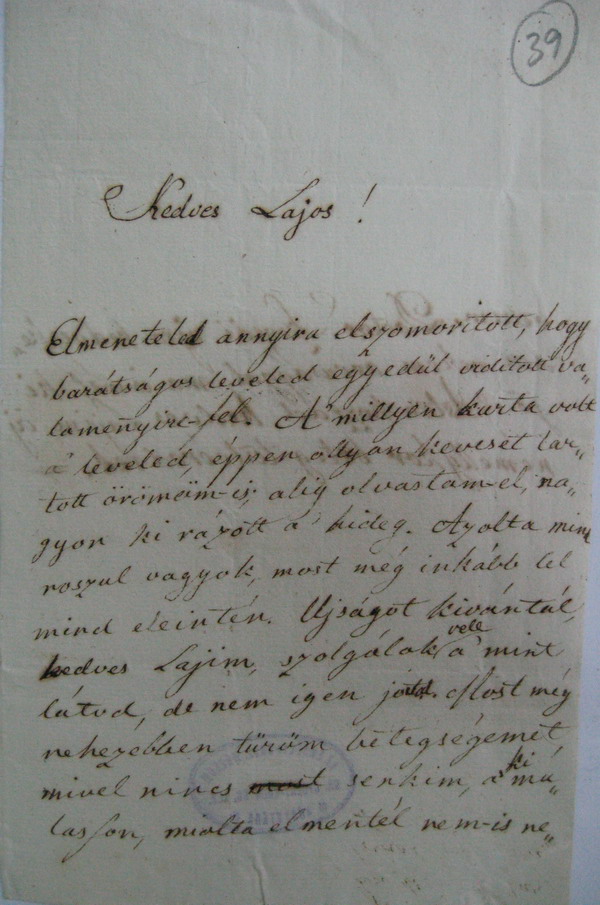 [39r] [idegen kézzel, ceruzával bekarikázva: 39] Kedves Lajos! Elmeneteled annyira elszomoritott, hogy barátságos leveled egyedűl viditott valamen[n]yire- fel. A'millyen kurta volt a' leveled, éppen ollyan keveset tartott örömöm-is; alig olvastam-el; nagyon ki rázott a' hideg. Azolta mind roszul vagyok, most még inkább lel mind eleintén. Ujságot kivántál, kedves Lajim, szolgálok vele[1] a' mint látod, de nem igen jóval[2]. Most még nehezebben türöm betegségemet, mivel nincs <most> senkim, a' ki[3] mulasson, miolta el mentél nem-is ne [1] Beszúrva: vele [2] „jóval" javítva „jót"-ból. [3] Beszúrva: ki |