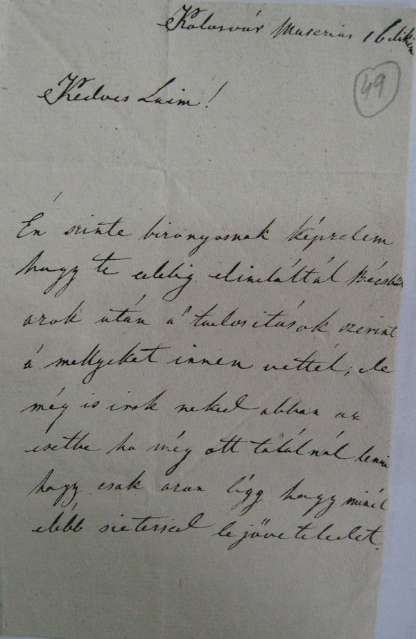 [49r] Kolosvár Marczius16 dikén Kedves Laim! Én szinte bizonyosnak képzelem hogy te eddig elindúltál Bécsből azok után a' tudositások szerint a' mellyeket innen vettél; de még is irok neked abban az esetbe ha még ott találnál lenni hogy csak azon légy hogy minél elébb sietessed le jőveteledet. |