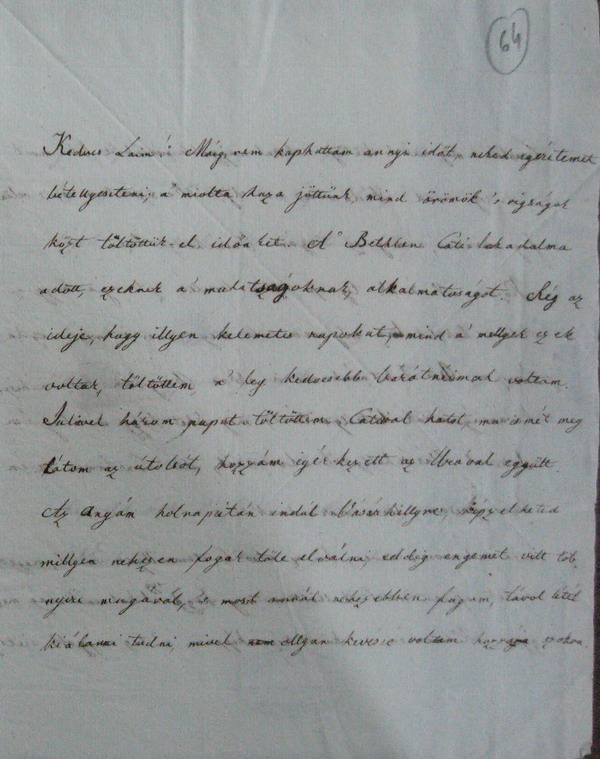 [64r] Kedves Laim! Máig, nem kaphattam annyi időt neked igéretemet bétellyesiteni; a' miolta haza jöttűnk, mind örömök 's ujságok kőzt tőltöttük-el időnket. A' Bethlen Cati lakadalma adott, ezeknek a' mulatságoknak[1], alkalmatoságot. Rég az ideje, hogy illyen kelemetes napokat, mind a' mellyek ezek voltak, tőltőttem, a' leg kedvesebb barátnéimal voltam. [1] A „mulatságoknak" javítva „mulatozásoknak"-ból. [2] Az „l" javítva „t"-ből. [3] Az „A" javítva „a"-ból. |