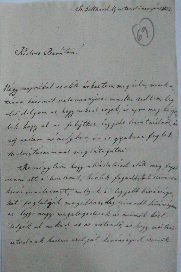 [69r] Sz.Gotthárd Uj esztendö napján 1822. Kedves Barátom!