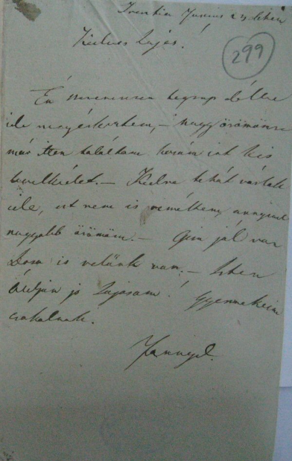 [299r] Tresztia Junius 23 diken Kedves Lajos! Én szerencsesen tegnap délbe ide megérkesztem, — nagy örömömre már itten találtam hozám irt kis levelkédet. — Kedre tehát várlak ide, ezt nem is reméltem, annyival nagyobb örömöm. — Gisa jól van Dosa is velűnk van. — Isten Áldjon jo Lajosom! Gyermekeim csokolnak. Fannyd. A képhez tartozó szöveg! |