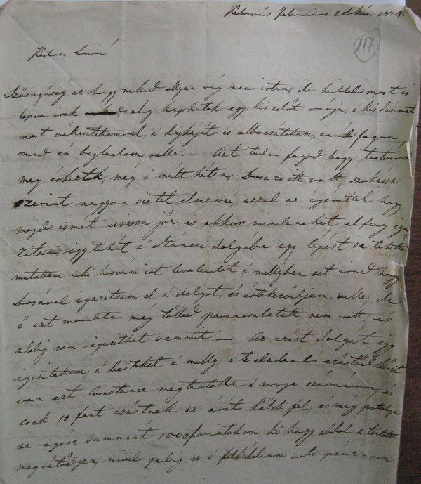 [117r] Kolosvár Februárius 2 dikán 1828. Kedves Laim! Szőrnyűség az hogy neked ollyan rég nem irtam, de hiddel most is lopva irok alig kaphatok egy kis időt reája; a' kis Josimat most vállasztottam el, a' dajkáját is bocsátottam, annál fogva mind én bajlodom velle. — Azt tudni fogod hogy testvérid meg érkeztek, még a' múlt héten, Dosa is itt volt, szokássa szerint nagyon sietet elmenni, azzal az igérettel hogy majd ismét vissza jőn és akkor mindeneket elfog igazitani; igy tehát a' Stánczi dolgába egy lépést se tehetté; mutattam neki hozzám irt leveleidet a' mellyben azt irod hogy Dosával igazitsam el a' dolgot, és értekeződjem velle, de ő azt mondta még tőlled parancsolatott nem vett, és addig nem igazithat semmit. — Az ezűst dolgát igy igazitattam; a' besteket a' melly a' te eladando ezűstőd kőzt van ezt Constance megtartotta a' maga számára, és csak 10 font ezűstnek az árát kűldi fel, és még potolja az egész summát 1000 forintokra ki hogy abbol a' toilette megvétődjen, mivel pedig ez a' felkűldenni valo pénz arra