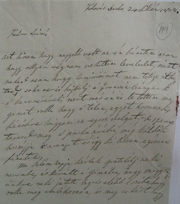 [119r] Kólosvár Decbr. 24dikén 1828. Kedves Laim! Azt hiszem hogy nagyobb volt az én bánatom azon hogy ollyan rég nem vehettem leveledet, mint neked azon hogy Comissioimat nem tellyesitheted; soha se-is bajlodj a' Franczia leánynak a' keresésével; mert már én is letettem magamat rolla hogy a' télen egyet hozzassak, későbre hagyom az egész dolgot. — A 17. aranyt tarcsd meg a' puska árába, még kűldők hozzájja 5. aranyat és igy ki lészen egésszen fizetve.