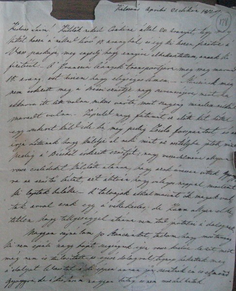 [128r] Kolosvár Aprilis 21.dikén 1829. Kedves Luim! Kűldők neked Csákiné által 20. Aranyat, tégy még kettőt hozzá a' nállad lévő 17. aranyból, és igy ki leszen fizetve a' Vass puskája; meg engedj hogy ennyire elhallasztattam, annak ki fizetését. — A' Franczia leányok transportjára még meg marad 15. arany, azt hiszem hogy elégséges leszen. — Stánczinak még nem erkezett meg a' Bécsi ezűstje nagy szerencséjére, mert ha akkorra itt lett volna mikor várta, most szegény minden nélkűl maradt volna. — Képzeld nagy fatumát, ez előtt két héttel egy szekeret kűld ide bé, még pedig Zsido forspantost, és az[t] irja Lottinak hogy kűldje el neki mint az osztályba jutott, mint pedig a' Bécsből érkezett ezűstjét; nagy veszedelmére ollyan rossz cselédeket kűldőtt utánna, hogy azok űressen vitték Gyógyra az ezűstős ládát, azt álitván hogy világos nappal mindent ki loptak belőlle. — A' talvajok alkalmasint ők magok voltak, arrol csak egy a' véllekedes; de Kunn ollyan elhetetlen hogy tellyeséggel utánna nem tud jártatni a' dolognak.