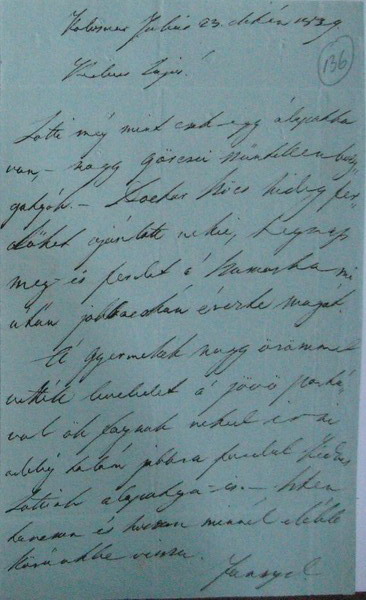 [136r] Kolosvar Julius 23. dikán 1839. Kedves Lajos! Lotti még mint csak egy álapotba van, — nagy görcsei szűntellen bolygatyák. — Doctor Szücs hideg ferdőket ajánlott nekie, tegnap meg-is ferdet a' Szamosba mi útán jobbacskán érezte magát.