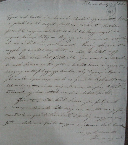 [141r] Kolosvár Martzius 6dikán Éppen most temetik a' mi kedves barátúnkat Gyarmatit, kűldőm a' jellentő levelét mellyet Bethlen Elek irt. Bethlen Gecziék annyira érdekelt ez a' halál hogy majd az egész ház nép beteg. — Még egy szomorú esett rémitette el ma a' Kolosvári publicumot, Kemény Feriné ma reggel 9. orakor meg hólt, ez elott 3 héttel egy gutta űtés érte bal felét, akkor igen rosszul vólt velle de csak hamar azután jobban kezdett lenni, és egész reménység vólt fel gyogyulásához, még tegnap ollyan jol vólt egész nap, senki se gondolt legkissebb veszedelmet-is, <...>[1] és ma már oda van; szegény A[n]yát[2] és testvérét ájúlva vitték ma el a' hallotti háztól. [1] Olvashatatlan.