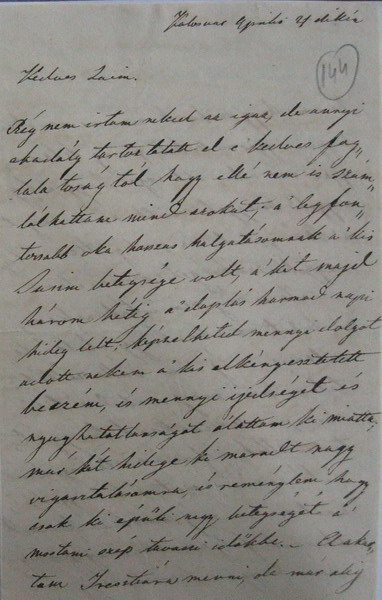[144r] Kolosvar Aprilis 21. dikén Kedves Laim. Rég nem irtam neked az igaz, de annyi akadály tartoztatott el e' kedves foglalatosságtól hogy ellé nem is számlálhattam mind azokat; a' legfontsabb oka hosszas halgatásomnak a' kis Susim betegsége volt, a' kit majd három hétig ő duplás harmad napi hideg lelt; képzelheted mennyi dolgot adott nekem a' kis elkényesztetett beczém, és mennyi ijedséget és nyughatatlanságot álattam ki miatta; már két hidege ki maradt nagy vigasztalásomra, és reménylem hogy csak ki épűli nagy betegségét a' mostani szép tavaszi időkbe. — Elakartam Trestiára menni, de már alig