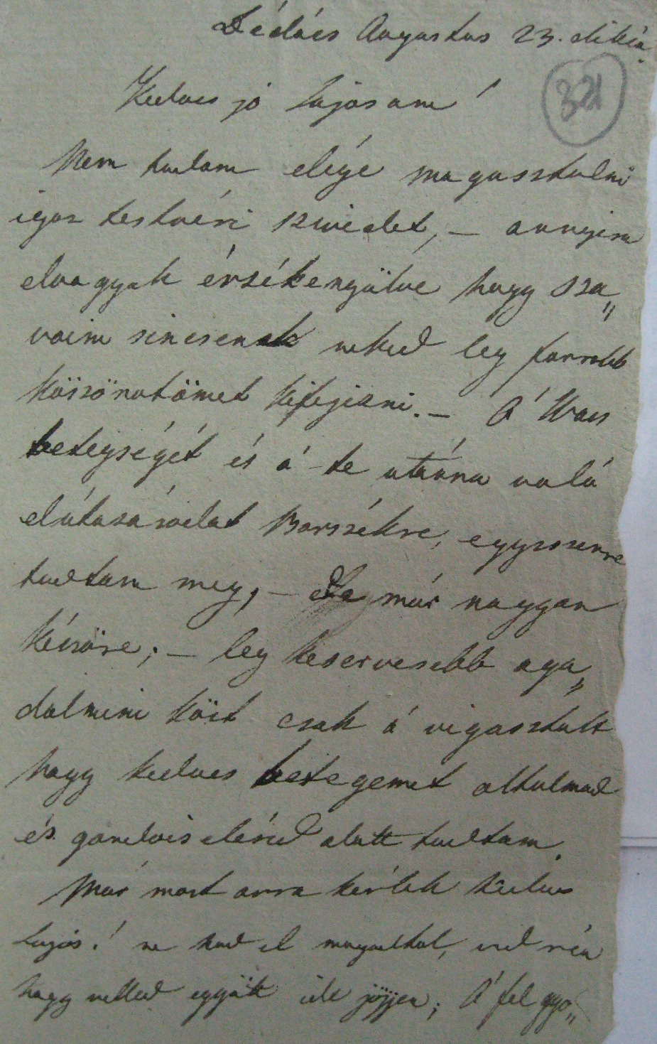[321r] Dédács Augustus 23.dikén Kedves jó Lajosam! Nem tudam elége magasztalni igaz testvéri szivedet, – annyira elvagyok érzékenyülve hogy szavaim nincsenek neked leg forrobb köszönotömet kifejezni. – A' Wass betegségét és a' te utánna való elútazásodat Borszékre, egyszerre tudtam meg, – de[1] már nagyon késöre; – leg keservesebb agadalmim közt csak a' vigasztalt hogy kedves betegemet oltalmad és gondviselésed alatt tudtam.