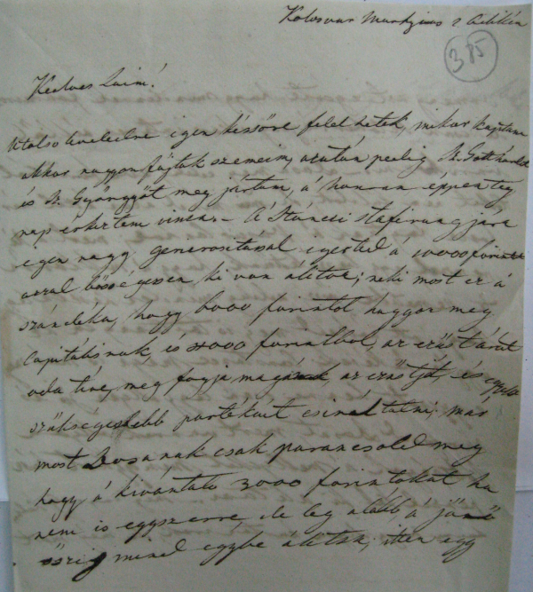 [385r] Kolosvar Martyius 2.dikkén Kedves Laim! Utolso leveledre igen késsőre felelhetek, mikor kaptam akkor nagyon fájtak szemeim, azután pedig Sz. Gotthárdot és Sz. Győrgyőt meg jártam, a' honnan éppen tegnap érkeztem vissza. — A' Stánczi stafirungjára igen nagy genirositással igerted a' 100000 forintot azzal bősségessen ki van álitva; neki most ez a' szándéka, hogy 6000 forintot hagyon meg. Capitálisnak, és 4000 forintbol, az ezűst árát oda téve, meg fogja magának, az ezűstjét, és egyebb szűkségessebb[1] portékáit csináltatni; már most Dosanak csak parancsold meg hogy a' kivántato 3000 forintokat ha nem is egyszerre, de leg alább, a' jővő őszig mind egybe álitsa; itten egy [1] A második „s" kivakarással újraírva.