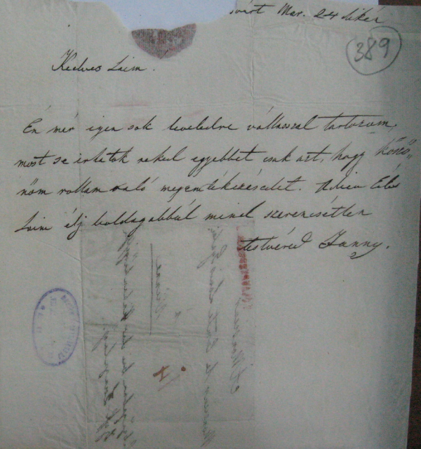 [389r] [Kolos]várt[1] Mar. 24 dikén Kedves Laim! Én már igen sok leveledre vállasszal tartozom; most se irhatok neked egyebbet csak azt, hogy kőszőnőm rollam való megemlékezésedet. Adieu Édes Laim élj boldogabbúl mind szerencsétlen [1] A levélpapír széle leszakadva.