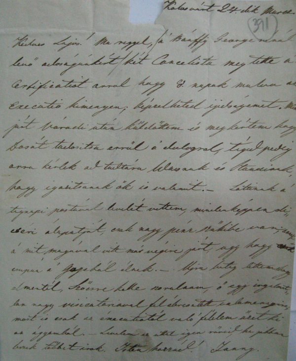 [391r] Kolosvárt 24.dik Marcz. Kedves Lajos! Ma reggel, /a' Bánffy Georgenénál levő adoságúnkért/ két Cancelista megtette a' Certificatiot arrol hogy 8. napuk mulva az Executio kimennyen; képzelheted ijedségemet. Min[d]járt[1] Váradi után kűldőttem és megkértem hogy Dosát tudositsa errűl a' dologrol, téged pedig arra kérlek ad tudtára Wassnak és Stanczinak, hogy igazitsanak ők is valamit. — Lottinak a' tegnapi postával levelét vettem, mindenképpen dicséri[2] álapatját, csak nagy pénz szűkibe van; annak a' mit magával vitt már végire járt, ugy hogy ˂csák˃ csupán a' Gageból[3] élnek. — Ujra beteg lettem, hogy elmentél, Szőcsre kelle szorulnom, ő egy irgalmatlan nagy visienturiaval felébresztett valamennyire; most is csak az éxecutiotól való félelem űzet ki az ágyamból. — Levelem ezuttal igen rővid, ha jobban leszek tőbbet irok. Isten hozzád! Fanny. [1] Fotóhiba miatt nem látszódik.