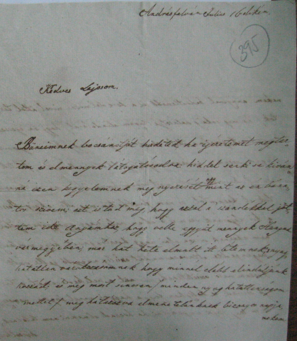 [395r] Andrásfalván Julius 16dikén. Kedves Lajosom. Büneimnek bocsánotját hirdeted, ha igéretemet megtartom és elmennyek látogatásodra: hiddel senki se kivánná ezen kegyelemnek megnyerését ugy[1] mint az én bánatos szivem; azt is tud meg, hogy azzal a' szándékkal jöttem ide Anyámhoz, hogy velle együtt mennyek Hunyadvármegyében; már hat hete elmúlt itt létemnek, s nyughatatlan várakozásomnak hogy minnél elébb elindúljúnk hozzád; és még most sincsen /minden nyughatatlanságom mellet/ meghatározva elmen[n]etelűnknek bizonyos napja, nekem [1] Beszúrva: ugy
