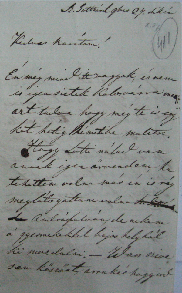Én még mind itt vagyok, és nem is igen sietek Kolosvárra me[rt][1] azt tudva hogy még te is egy két hétig Németibe mulatsz. [1] Bizonytalan olvasat a tintafolt miatt. |