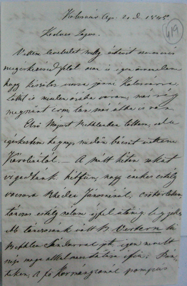 Vettem leveledet melly értesit szerencsés megérkezésed felöl: azon is igen örvendem hogy készölsz vissza jönni Kolosvárra: Lottit is minden órába várom, már rég megszűnt irni, tán már útba is van. [1] A pont idegen kéz által, ceruzával beírva. |