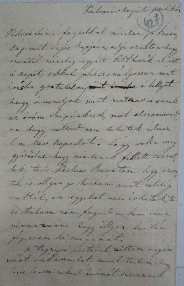 Kedves Laim! Fogadd el minden jo kivánságimat Lajos Napjára; adja az Isten hogy ezentúl mindég egyűtt tőlthessűk el ezt a’ napot; sokkal jobb személyessen mint irásba gratulálni, ˂mint irásba˃ a’ hellyet hogy őrvendjek mint mátszor[1] is ennek az őrőm Inepűnknek, most elszomorodva hogy velled nem lehetek idvezlem Név Napodat. Légy rolla meg győződve hogy mindenek fellett szeretlek, te is Kedves Barátom legy ezentul is ollyan jo hozzám mint eddig voltál, én egyebet nem irhatok, te is tudom nem fogod nekem rossz neven venni[2] hogy illyen kurtán fejezzem ki magamat. [1] A „z” ugyanazzal a tintával javítva. |