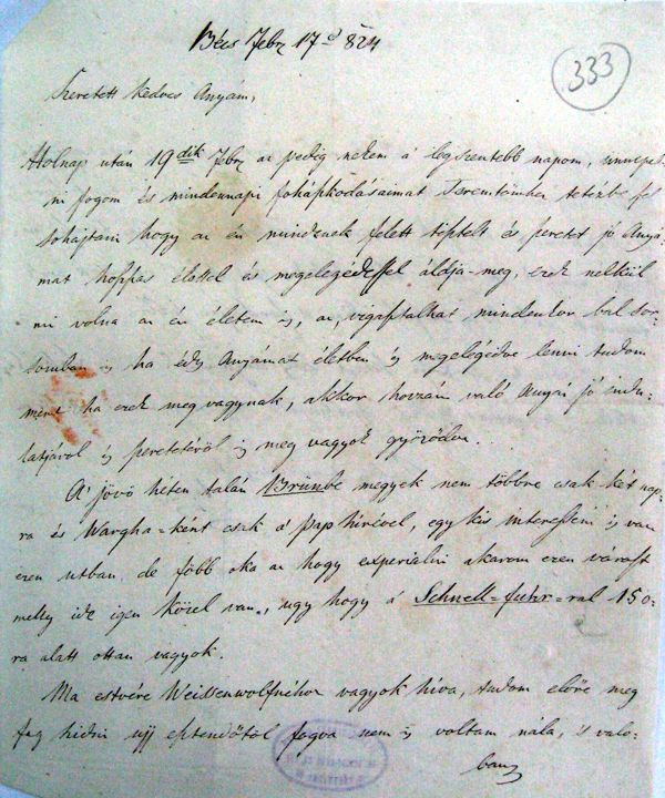 [333r] Bécs Febr 17d [1]824 Szeretett kedves Anyám, Holnap után 19dik Febr az pedig nekem a’ legszentebb napom, ünnepelni fogom és mindennapi fohászkodásaimat Teremtőmhez tetézbe fel sohajtani hogy az én mindenek felett tisztelt és szeretet jó Anyámat hoszszas élettel és megelégedessel áldja-meg, ezek nélkül mi volna az én életem is, az, vigasztalhat mindenkor bal sorsomban is ha édes Anyámat életben és megelégedve lenni tudom mert ha ezek meg vagynak, akkor hozzám való Anyai jó indulatjárol és szeretetéröl is meg vagyok gyöződve.
