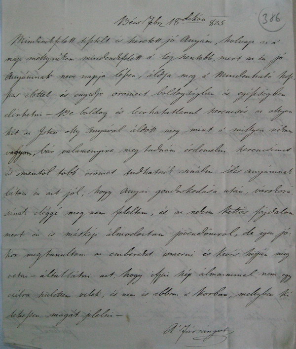 [386r] Bécs Febr 18dikán [1]825 Mindenekfelett tisztelt és szeretett jó Anyám, holnap az a’ nap melly nékem mindenekfelett a’ legszentebb, mert az én jó Anyámnak neve napja lészen, áldja meg a’ Mindenható hoszszas élettel és engedje örömeit boldogságban és egészségben elérhetni – Be boldog és leirhatatlanul szerencsés az ollyan kit az Isten olly Anyával áldott meg mint a’ millyen nékem vagyon,[1] bár valamenyire megtudnám érdemelni szerencsémet és mentöl több örömet tudhatnék csinálni édes anyámnak látom én azt jól, hogy Anyai gondoskodása után, várokozásának eléggé meg nem feleltem, és az nekem kettös fájdalom mert én is máskép álmodoztam jövendőmröl, de igen jókor megtanultam az embereket ismerni és kevés hijján meg vetni – általlátni azt, hogy ifjui szép álmaimmal nem egy czélra születtem velek, és nem is abban a’ korban, mellyben ki lehessen magát jelelni – a’ [Fársángot][2]