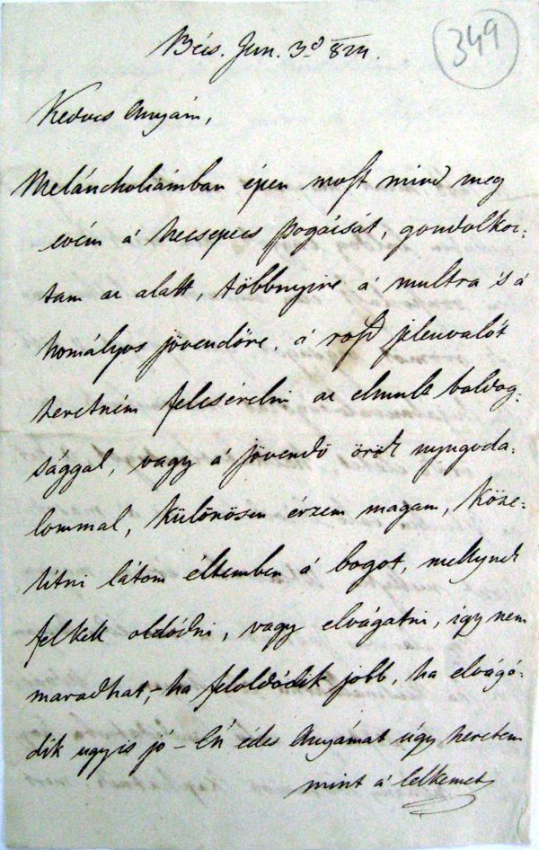 [349r] Bécs Jun. 3d [1]824 Kedves Anyám, Meláncholiámban épen most mind meg evém a’ hecsepecs pogácsát, gondolkoztam az alatt, többnyire a’ multra ’s a’ homályos jövendőre, a’ rosz jelenvalót szeretném felcserelni az elmult boldogsággal, vagy a’ jövendö örök nyugodalommal. különösen érzem maga, közelítni látom éltemben a’ bogot, mellynek felkell oldódni, vagy elvágatni, így nem maradhat, — ha feloldódik jobb, ha elvágódik ugyis jó — Én édes Anyámat úgy szeretem mint a’ lelkemet |