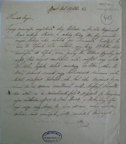 Tegnap szerencsésen megérkezém idáig Döbrentei is ki édes Anyámnak kezeit csókolja elkisért, és nehány hétig itten fog maradni magam, holnap után indulok, per Szaravola Erdélybe, lovaim ki lesznek előre rendelve, ugy hogy 19dikén délre reménylem ott leszek, onnan pedig ha Albert Gyulay elereszt, két napot mulatván nála, másfél nap alatt Németiben leszek, tehát mintegy 23dikán, otthon ha Utzás szekeret szerzett vagy kölcsönözött számomra valakitöl, mindjárt indulok oda hol édes Anyámat fogom lenni tudni, örömöm rendkivül való, hoszszas távollétem után az én mindenek felett tisztelt jo Anyámat ujra láthatni, – Pest és Bécs között a' külömbség iszonyu nagy ugy, hogy ha Coco itt nem volna azt sem tudnám mit csináljak, érette mulatok két napot