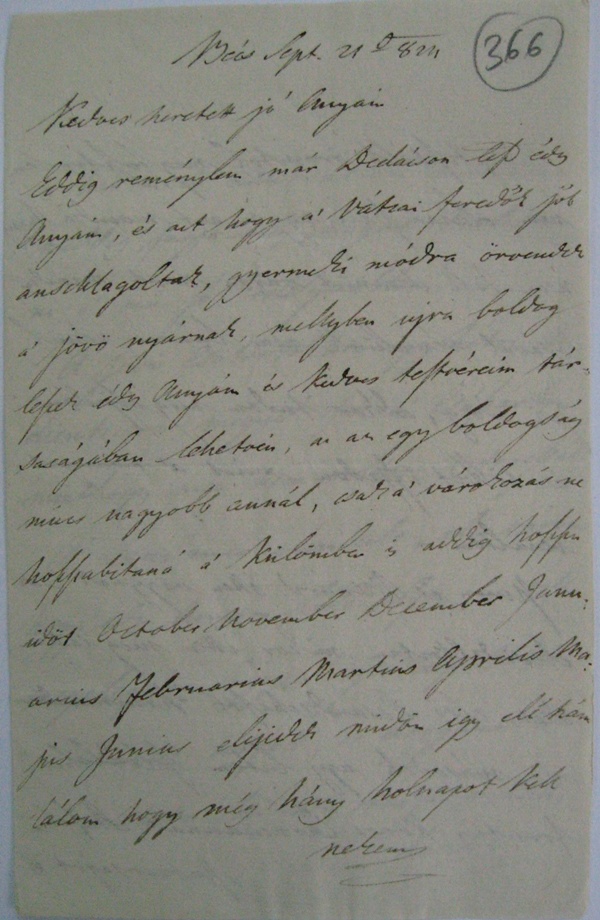 Eddig reménylem már Dedácson lesz édes Anyám, és azt hogy a’ Vátzoi feredők jól anschlagoltak, gyermeki módra örvendek a’ jövö nyárnak, mellyben ujra boldog leszek édes Anyám és kedves testvéreim társaságában lehetvén, az az egy boldogság nincs nagyobb annál, csak a’ várakozás ne hoszszabitaná a’ külömben is addig hoszszu idöt October November December Januarius Februarius Martius Aprilis Majus Junius elijedek midön igy elé számlálom hogy még hány holnapot kell nekem |