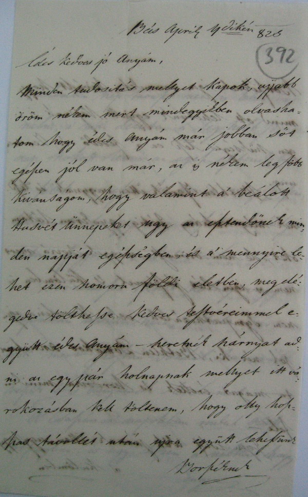 [392r] Bécs, April 4dikén [1]825 Édes kedves jó Anyám, Minden tudositás mellyet kapok, ujjabb öröm nékem mert mindegyikben olvashatom hogy édes Anyám már jobban sőt egészen jól van már, az is nékem legföbb kivánságom, hogy valamint a’ beálott Husvét ünnepeket ugy az esztendőnek minden napját egészségben, és a’ mennyire lehet ezen szomoru földi eletben, megelégedve tölthesse kedves testvéreimmel együtt édes Anyám – szeretnék szárnyat adni az egy pár holnapnak mellyet itt várokozásban kell töltenem, hogy olly hoszszas távollét után ujra együtt lehessünk [Borszéknek][1]