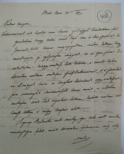 Kolosvárrol irt levelét nem kevés ijedséggel bontottam fel gondolván hogy talán ismét baja van a' kis Gizának de Istennek hálá hamar megnyugodtam, midön láttam hogy mindnyájan jó egészségben vagynak, én is igen jóval dicsekedhetem – nagy vadász lett belölem, a' mult héten Láscéban voltam vadaszni Grof Kolonicsnál, 's a jövö hétre elvagyok hiva az Anglus követnek egy vadászatjára reménylek szerencsesebb lenni mint az elsőben mellyben csak két nyulat löttem, holott valami 30 lövést tettem a' négy hajtás alatt.–