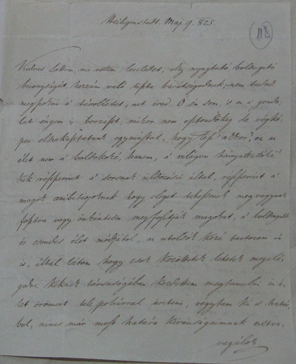 Kedves Lottim, ma vettem leveledet, olly nyugtató, boldogitó bizonyságát, hozzám való tiszta barátságodnak, — nem tudod megszokni a’ távollétet, azt irod, Ó én sem, ’s az a’ gondolat éngem is borzaszt, mikor nem esztendökig de végképen elszakasztatunk egymástol, hogy lesz akkor? ez az élet nem a’ boldokoké, hanem, a’ világon hányattatóké! Kik részszerint a’ sorsnak üldözései által, részszerint a’ magok ambitiojoknak hogy eleget tehessenek meg vagynak fosztva vagy önkéntesen megfosztják magokat, a’ boldogabb és csendes élet módjátol, az utolsók közé tartozom én is, által látom hogy csak közöttetek lehetek megelégedve kiknek társaságában kezdettem megtanulni az élet örömeit tele pohárral üriteni, vágytam ki a’ határbol, nincs már most határa kiváncsiságaimnak extra[vagálok][1] [1] A szó őrszóként funkcionál. |