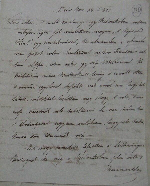 Kedves Lottim, a’ mult vasárnap egy Redoutteban voltam, mellyben igen jól mulattam magam, ’s képzeld kivel? egy maszkarával, ki álmamban is eszembe nem jutott volna — Emlékezel mikor Temesvárt voltam elöszszer, irtam neked egy szép Vetzlárnerol, ki születésére nézve Büdöskuti leány ’s ez volt ottan ’s minden egyébbröl beszélett csak arrol nem hogy hol látott, másoktol halottam meg hogy ö volt, ’s már most szeretnék vele találkozni de nem tudom hol ’s ábrázatjarol ugy nem emlékezem, hogy vele találkozva sem ismernék reá —