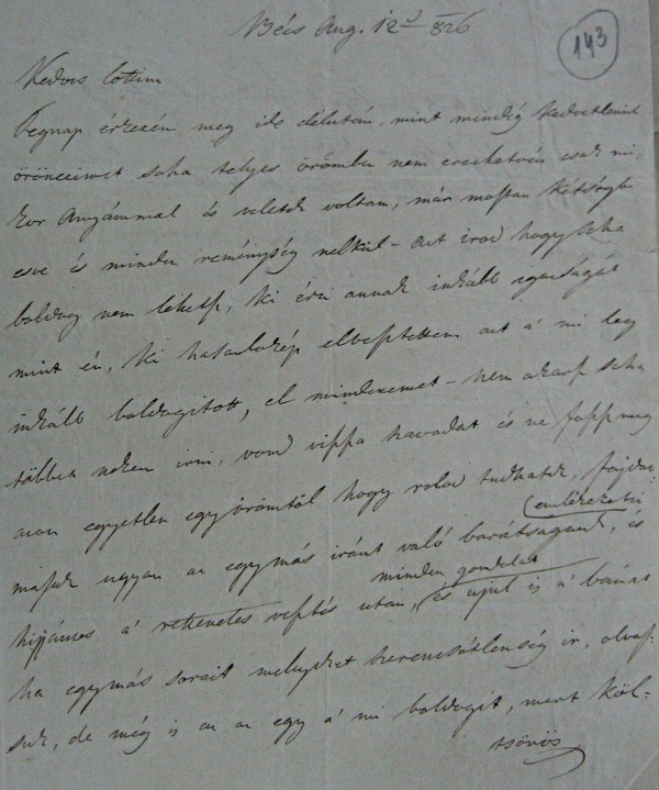 Tegnap érkezém meg ide délután, mint mindég kedvetlenül örömeimet soha telyes örömben nem erezhetvén csak mikor Anyámmal és veletek voltam, már mostan kétségbesve és minden reménység nelkül — Azt irod hogy soha boldog nem lehetsz, ki érzi annak inkább igazságát mint én, ki hasonlokép elvesztettem azt a’ mi leg inkább boldogitott, el mindenemet — nem akarsz soha többet nekem irni, vond viszsza szavadat és ne foszsz meg azon egyetlen egy örömtöl hogy rolad tudhatok, fajdalmasuk ugyan az egymás iránt való barátságunk emlékezetei[1], és hijjános a’ rettenetes vesztés után, minden gondolat[2] és ujul is a’ bánat ha egymás sorait mellyeket szerencsétlenség ir, olvassuk, de még is az az egy a’ mi boldogit, mert köl-[tsönös][3]