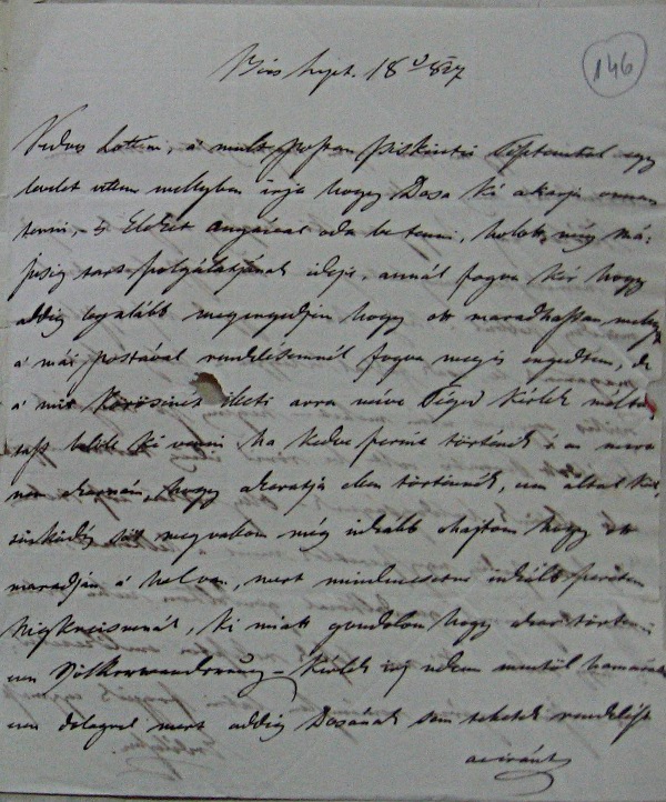 [146r] Bécs Szept. 18d [1]827 Kedves Lottim, a’ mult postan Piskintzi Tisztemtöl egy levelet vettem mellyben írja hogy Dosa ki akarja onnan tenni, — és Eleket anyával oda betenni, holott még májusig tart szolgálatjának ideje, annál fogva kér hogy addig legalább megengedjem hogy ott maradhasson, mellyet a’ mái postával rendelésemnél fogva meg is engedtem, de a’ mi<t> Körösinét illeti arra nézve Téged kérlek méltó[z]tass[1] belöle ki venni ha kedve szerint történik é az mert nem akarnám, hogy akaratja ellen történnék, ezen által költözködés sőt megvallom még inkább ohajtom hogy ott maradjon a’ hol van, mert mindenesetre inkább szeretem Nigkreisnenál, ki miatt gondolom hogy akar törtenni ezen Völkerwanderung — kérlek irj nekem mentöl hamarább ezen dologrol mert addig Dosának sem tehetek rendelést [az iránt][2]