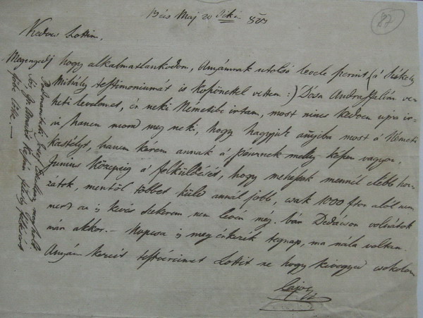 Bécs Maj 20dikén [1]823 Kedves Lottim, Megengedj hogy alkalmatlankodom, Anyámnak utolsó levele szerint, (a’ Székely Mihály testimoniumát is köszönettel vettem:) Dósa Andrasfalván veheti levelemet, én neki Németibe irtam, most nincs kedvem ujra irni, hanem mond meg neki, hogy hagyjuk an[n]yiba most a’ Németi kastélyt, hanem kérem annak a’ pénznek melly készen vagyon, Junius közepeig a’ felküldését, hogy mehessek mennél elébb hozzátok, mentöl többet küld annál jobb, csak 1000 fton alól nem mert az is kevés szekerem nem levén még. bár Dedácson volnátok már akkor. – Nopcsa is meg érkezék tegnap, ma nála voltam. Anyám kezeit testvéreimet Lottit ne hogy kivegyed csokolom Lajos. Podmanitzki Josef Excellenz megholt. Sós, Gr. Amadét Kassán feleség féltésért főbe lőtte. –[1]