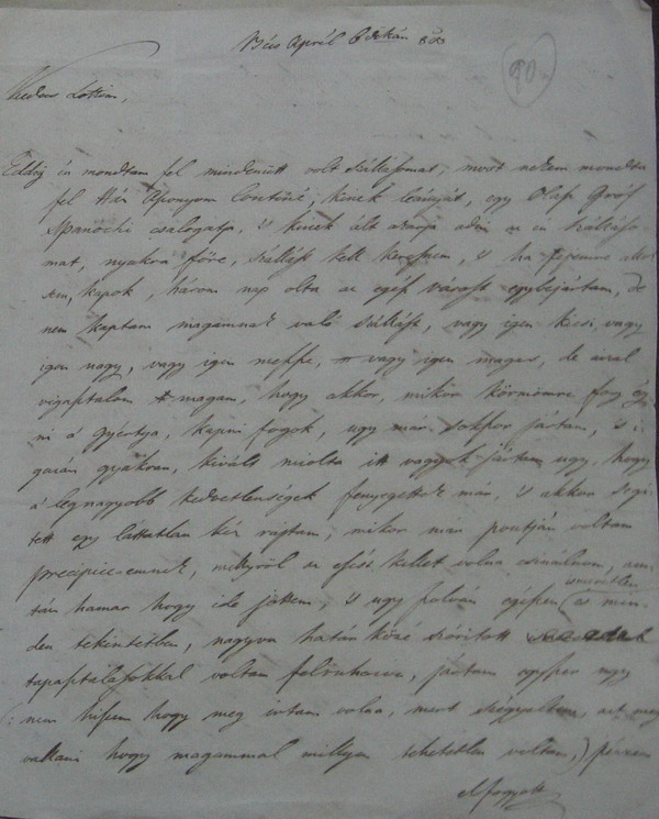 [90r] Bécs Apríl 6dikán [1]823 Kedves Lottim, Eddig én mondtam fel mindenütt volt szállásomat, most nekem mondta fel Ház Aszonyom Continé, kinek leányát, egy Olasz Gróf Spanochi csalogatja, ’s kinek ált akarja adni az én szállásomat, nyakra főre, szállást kell keresnem, ’s ha fejemre allok sem, kapok, három nap olta az egész várost egybejártam, de nem kaptam magamnak való szállást, vagy igen kicsi, vagy igen nagy, vagy igen meszsze, <n> vagy igen magas, de azzal vigasztalom <t> magam, hogy akkor, mikor körmömre fog égni a’ gyértya, kapni fogok, ugy már sokszor jártam, ’s igazán gyakran, kivált miolta itt vagyok jártam ugy, hogy a’ legnagyobb kedvetlenségek fenyegettek már, ’s akkor segitett egy láttatlan kéz rajtam, mikor már pontján voltam precipice-emnek, mellyröl az esést kellet volna csinálnom, azután hamar hogy ide jöttem, ’s ugy szolván egészen ismeretlen[1] és minden tekintetben, nagyon határ közé szóritott <ismeretekkel> tapasztalasokkal voltam felruházva, jártam egyszer ugy (nem hiszem hogy meg irtam volna, mert szégyeltem, azt meg vallani hogy magammal millyen tehetetlen voltam,) pénzem [elfogyott][2]