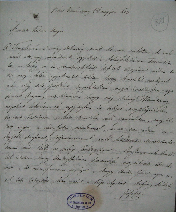 [325r] Bécs Karácsony 1ső napján [1]823 Szeretett Kedves Anyám A’ Templomba a’ nagy sokaság miatt be nem mehettem, de valamint ott, ugy mindenütt egyebüt is fohászkodásom Teremtőmhez az, hogy az én mindenekfelett tisztelt Anyámat nékem tartsa meg, belém igyekezetet töltsön, hogy szeretetét mellynek már olly sok példáit tapasztaltam megérdemelhessem, – igen szeretett Anyám, azt kivánom hogy még számos Karátsony napokat érhessen – el egészségben és telyes megelégedésben szeretett testvéreim is, kik szüntelen való gondolatim, – megáldott éngem az Ur-Isten mindennel, mert nem adván az én legjobb Anyámat, testvéreimmel való költsönös szeretetünket, semmi más lelki és világi boldogságért. – Constancenak leveléböl értettem hogy Andrásfalvára szerencsésen megérkezett édes Anyám, és azon szomoru ujságot is hogy Haller Jósit ujra utol érte betegsége, kár azért a’ szép ifjuért – Szegény[1] Székely [Jósefet][2] [Pecsét: Az Erdélyi Orsz. Múzeum Könyvtára – Gr. Gyulay–Kuun 68. Lev.]