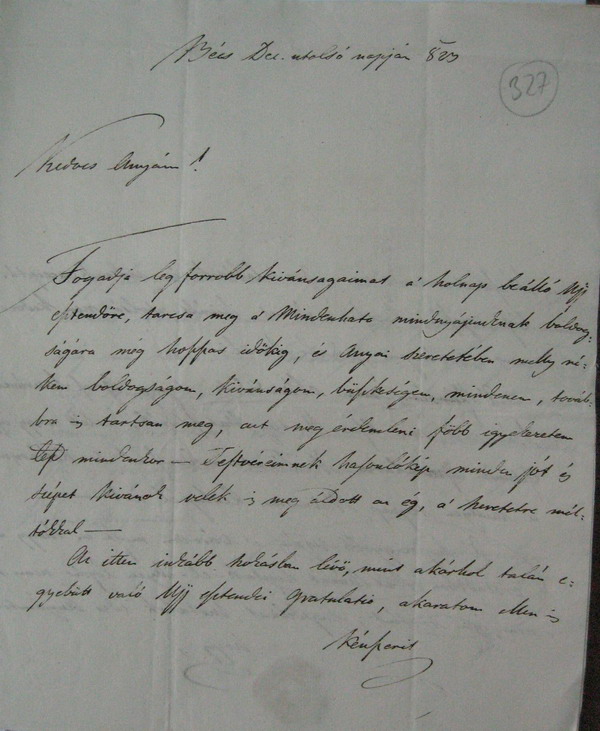 [327r] Bécs Dec. utolsó napján [1]823 Kedves Anyám! Fogadja legforrobb kivánsagaimat a’ holnap beálló Ujj esztendőre, tarcsa meg a’ Mindenhato mindnyájunknak boldogságára még hoszszas időkig, és Anyai szeretetében melly nékem boldogságom, kivánságom, büszkeségem, mindenem, továbbra is tartsan meg, azt megérdemleni föbb igyekezetem lesz mindenkor – Testvéreimnek hasonlókép minden jót és szépet kivánok velek is meg áldott az ég, a’ szeretetre méltókkal –