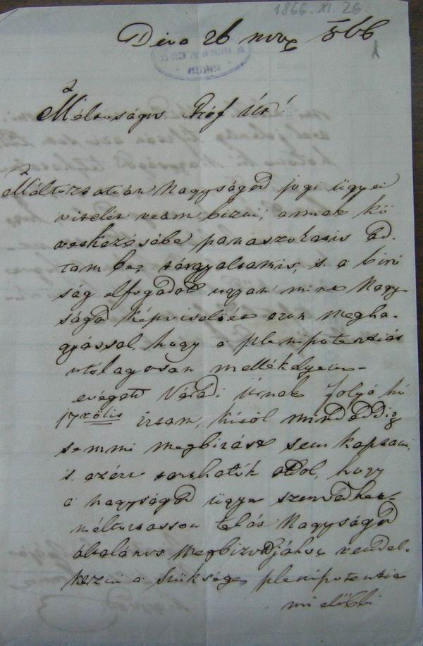 Méltoztatván Nagyságod jogi ügyei vitelét reám bizni, annak következésébe panaszokat is adtam be; tárgyaltam is, s a bíróság elfogadott ugyan mint Nagyságod képviselöét azon meghagyással, hogy a’ plenipotentiát utólagosan mellékelyeim – evégett Váradi Úrnak folyó hó 17rölis írtam, kitől mindeddig semmi megbizást sem kaptam, s az ért tarthatók attol, hogy a nagyságod ügye szenvedhet – méltoztasson tehát Nagyságod általános megbizottjához rendelkezni a szükséges plenipotentia
