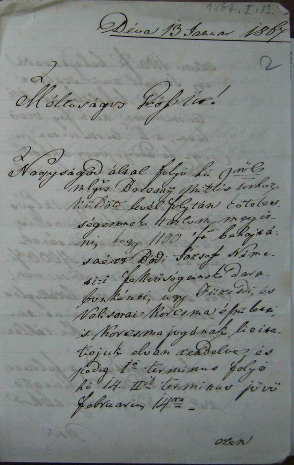 Nagyságod által folyó hó 9ről m[é]l[tósá]gos Barcsaÿ Miklós Urhoz küldött levél folytán kötelességemnek tartom megirni, hogy 1100[ft] behajtásaért Bódi József Németi-i fekvőségeinek darabonkénti, ugy Füzesdi, és Valisorai korcsma épületei, s korcsma jogának licitatiojuk elvan rendelve és pedig 1ö terminus folyó hó 14 IIik terminus jövö februarius 14re - A képhez tartozó szöveg! |