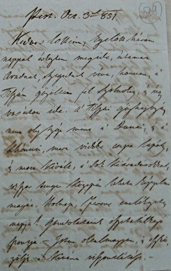 [529r] Pest. Oct. 3d. [1]851. Kedves Lottim, Ezelött három nappal érkeztem meg ide, útamat Aradnak, Szegednek véve, honnan, a’ Tiszán gőzöltem fel Szolnokig, és úgy vas úton ide. A’ Tiszai gőzhajózás nem oly szép mint a’ Dunai, és a’ Rhónuti, mert vidéke csupa lapály, és most kivált, a’ sok kiáradásokkal, sokszor tenger közepén lehete képzelni magát. Holnap, Ferenc emlékezetes napja! Gondolataink öszetalálkozó pontja. — Isten oltalmazzon, és eszközölje a’ kivánt viszontlátást. — |